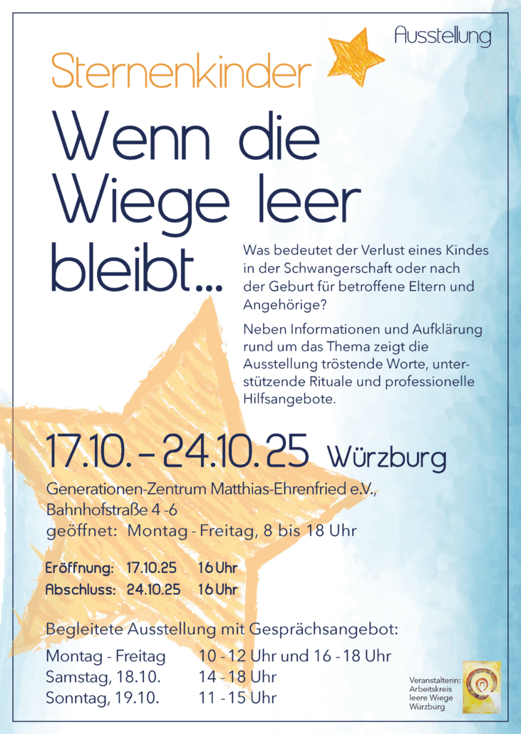 Der Arbeitskreis Leere Wiege holt die Wanderausstellung Sternenkinder – Wenn die Wiege leer bleibt vom 17. bis 24. Oktober nach Würzburg. Zu sehen ist sie im Matthias-Ehrenfried-Haus wochentags in der Zeit von 8.30 – 16.30 Uhr.